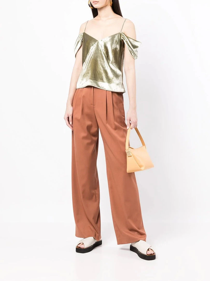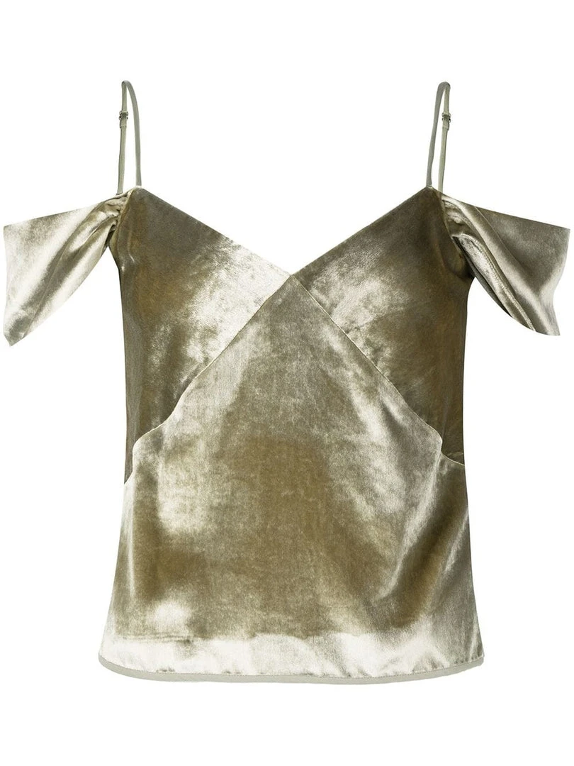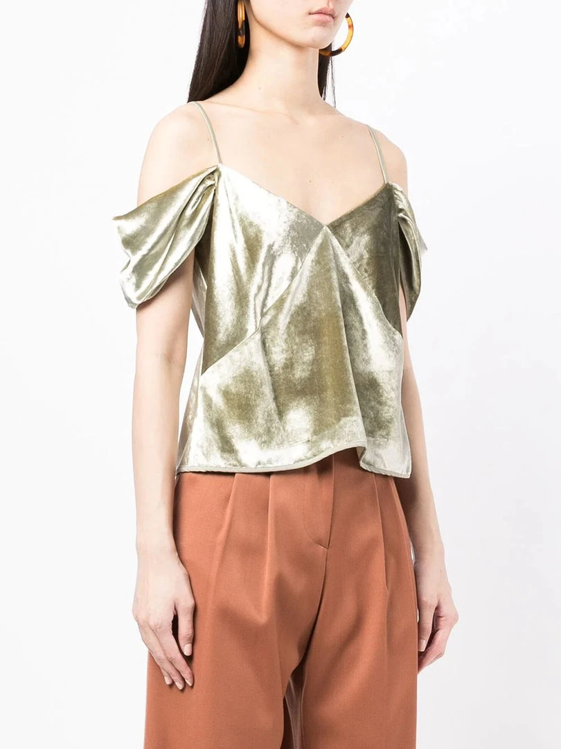 Vince pistachio green ‘Off The Shoulder Velvet Camisole’ featuring a V-neckline, adjustable spaghetti straps, ruffled off-the-shoulder sleeves, a side zip fastening and a soft velvet finish. Item fits true to size. Model is wearing a size 4 US.Â