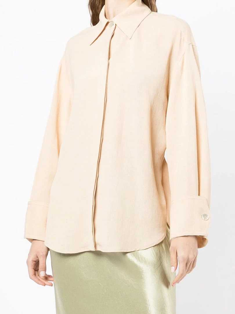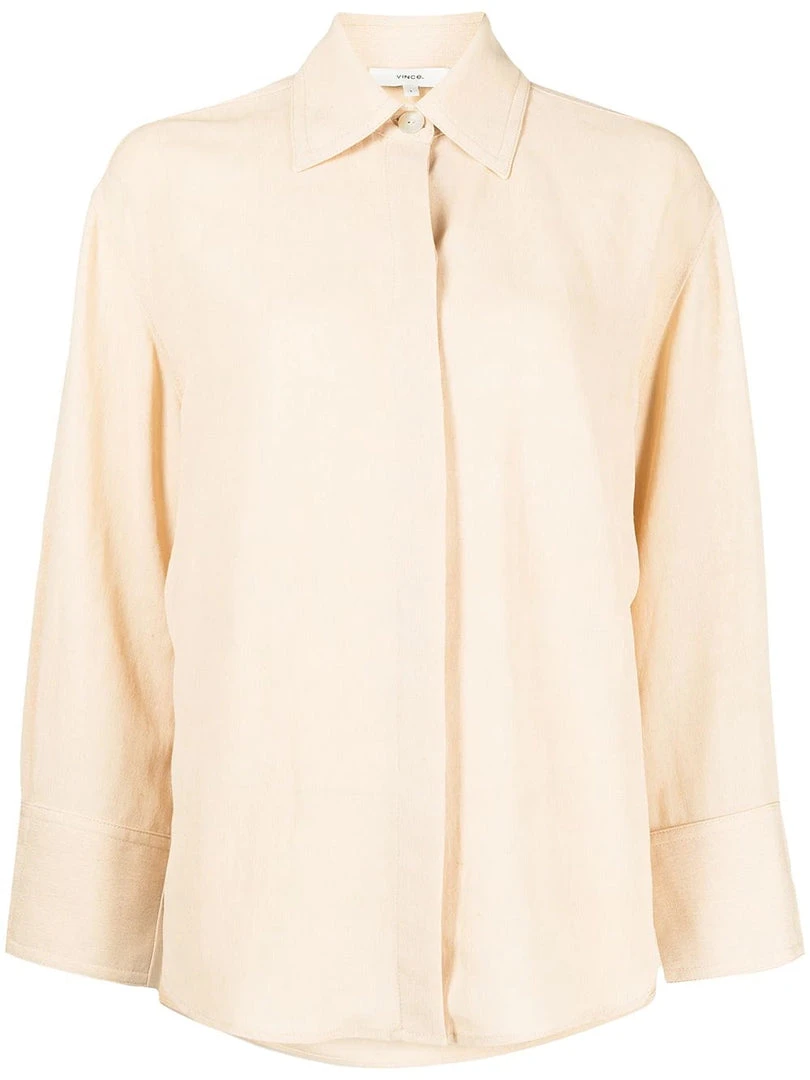 Vince light beige ‘Open Back Tie Fastened Shirt’ featuring a classic collar, a front button fastening, long sleeves with buttoned cuffs, side slits, an open back design with a tie fastening detail, a curved hemline and a relaxed fit. Item fits true to size. Model is wearing a size XS.
