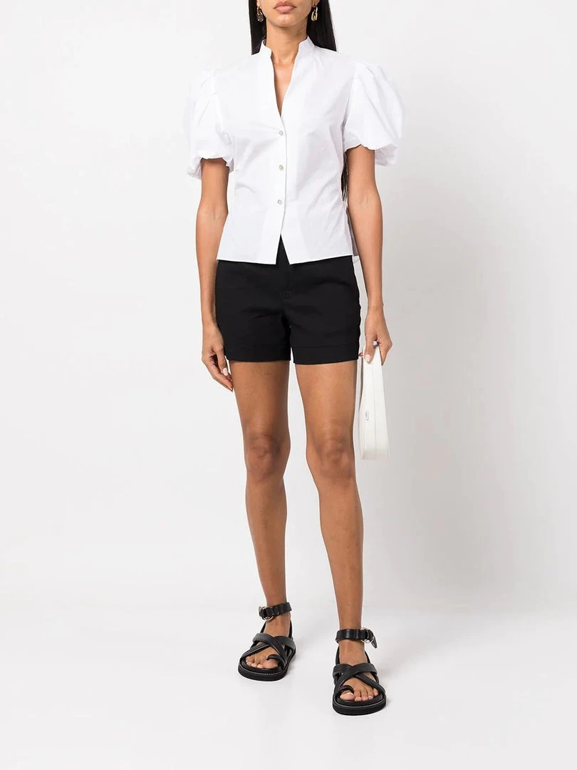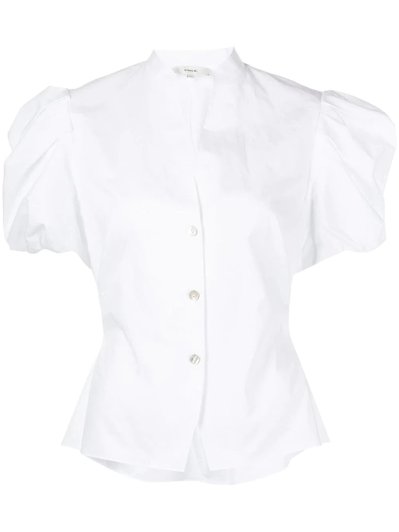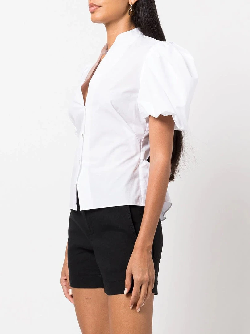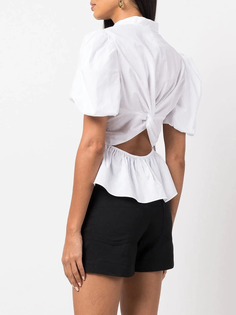 Vince white ‘Draped Puff Sleeve Blouse’ featuring a round collared neck, front button fastenings, short puffed sleeves with elasticated cuffs and a back knotted detail with a lower cut out design. Item fits true to size. Model is wearing a size 4 US.