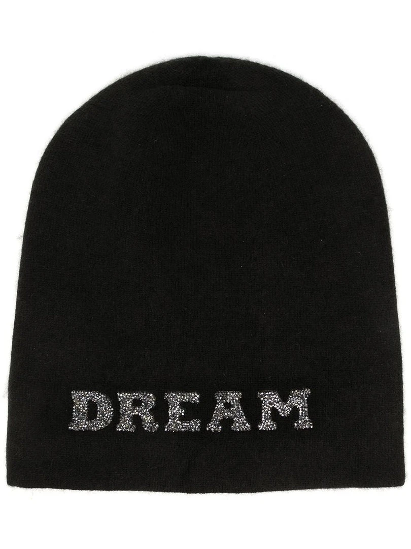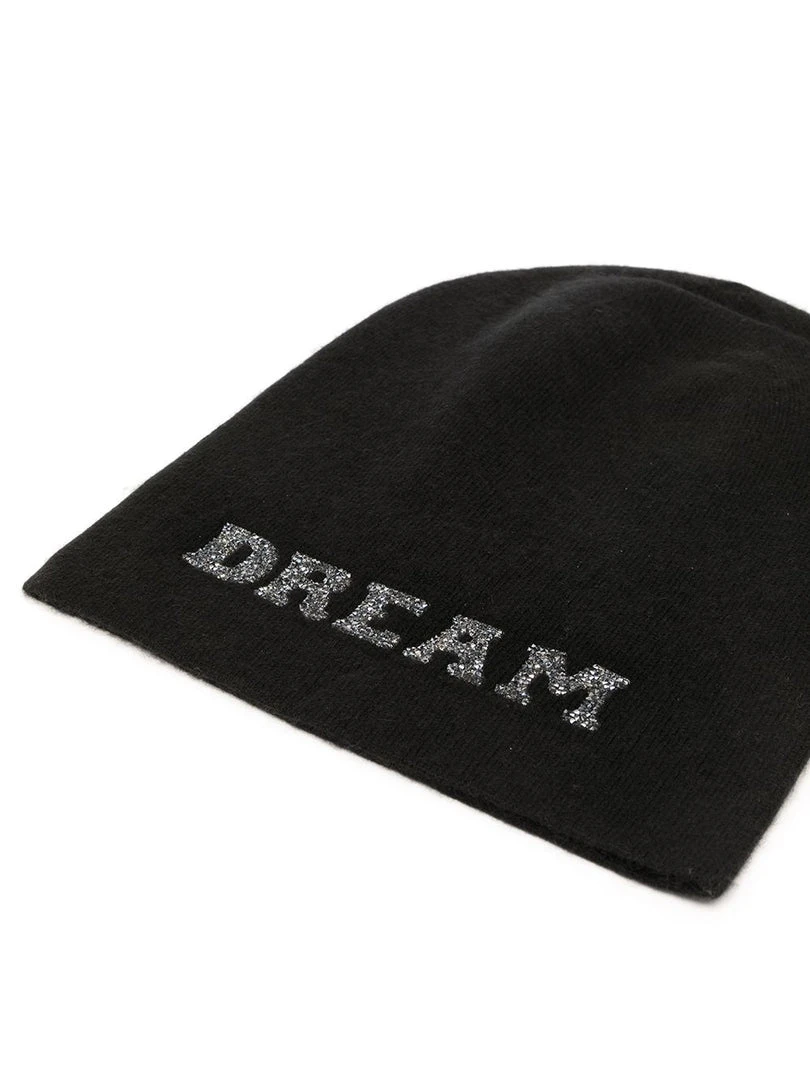 Warm-Me handmade cashmere ‘Damian Dream Black Crystal Hat’ featuring a front ‘Dream’ design embellished with black Swarovski crystals, a pull on style and a slouchy fit. Made in Nepal. One Size.Â