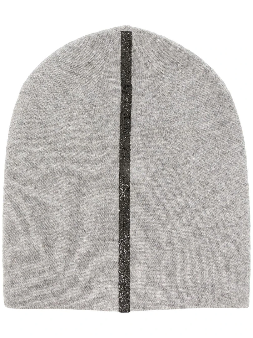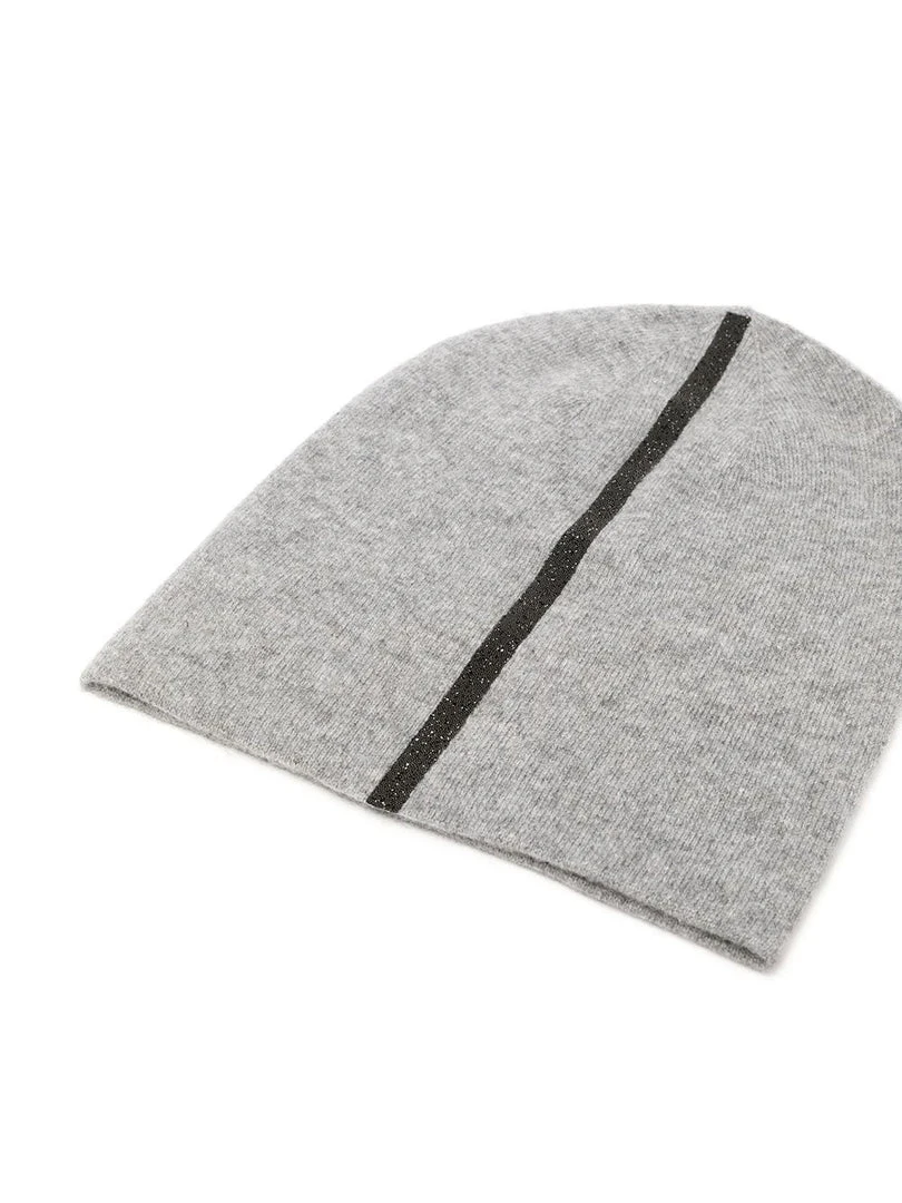 Warm-Me grey handmade cashmere ‘Damian Stripe Hem Hat’ featuring a front stripe design embellished with black Swarovski crystals, a pull on style and a slouchy fit. Made in Nepal. One Size.Â