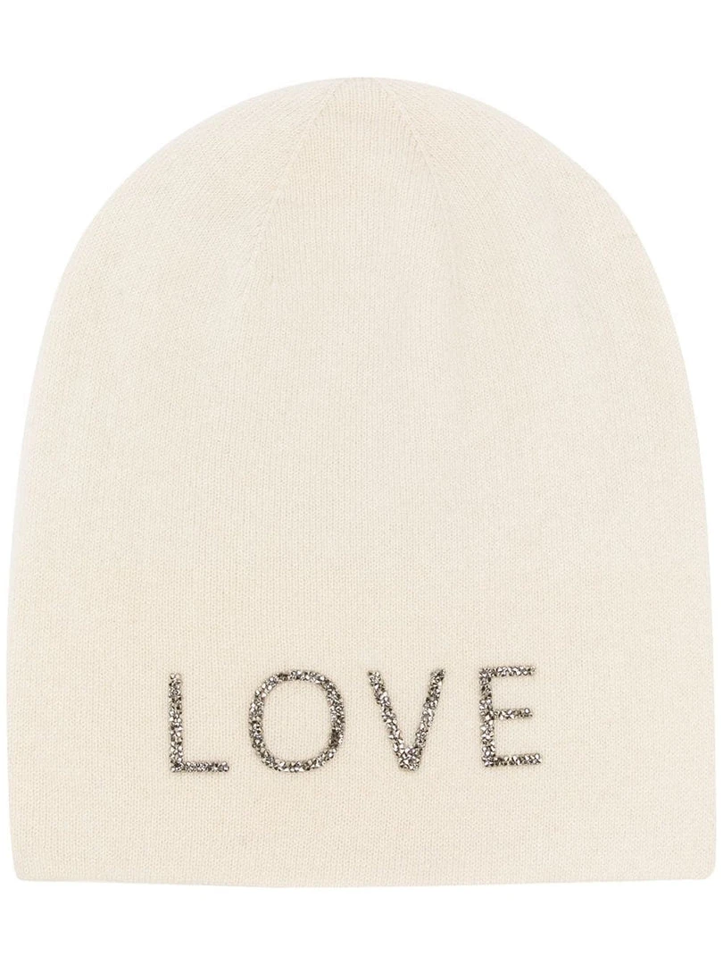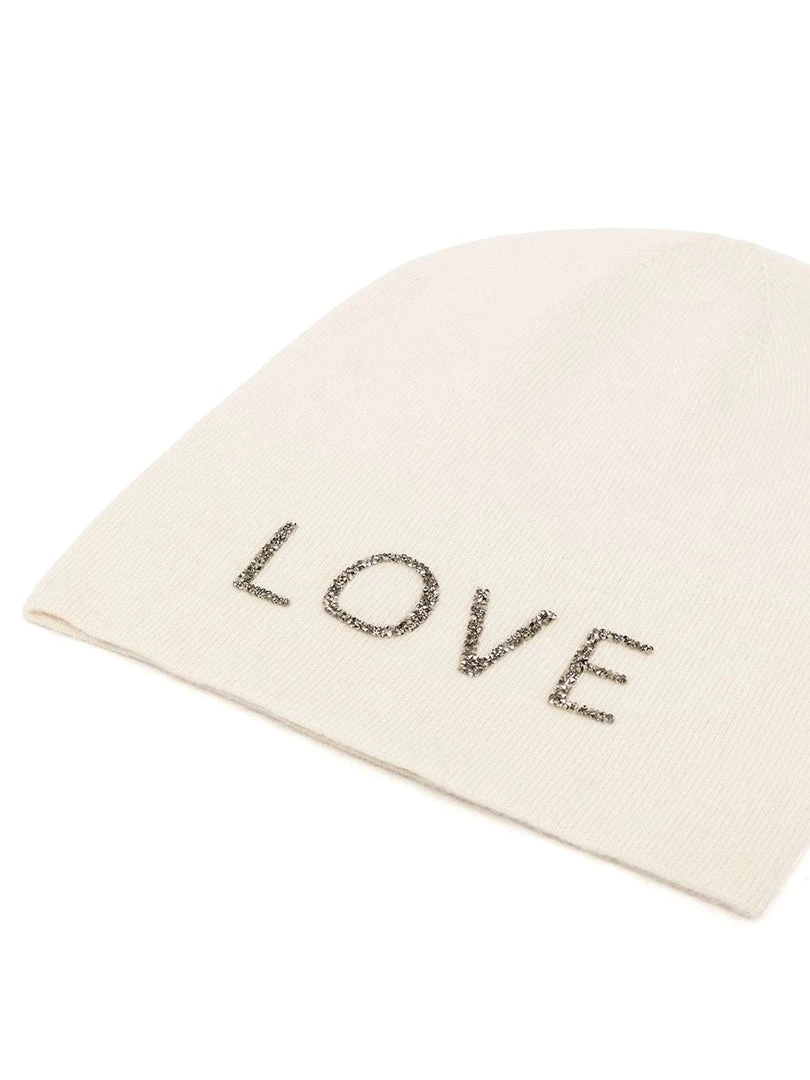 Warm-Me white handmade cashmere ‘Damian Love Silver Crystal Hat’ featuring a front ‘Love’ design embellished with silver Swarovski crystals, a pull on style and a slouchy fit. Made in Nepal. One Size.Â
