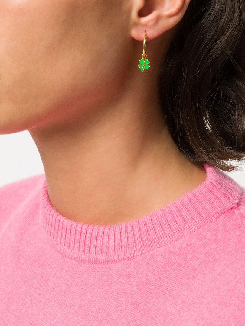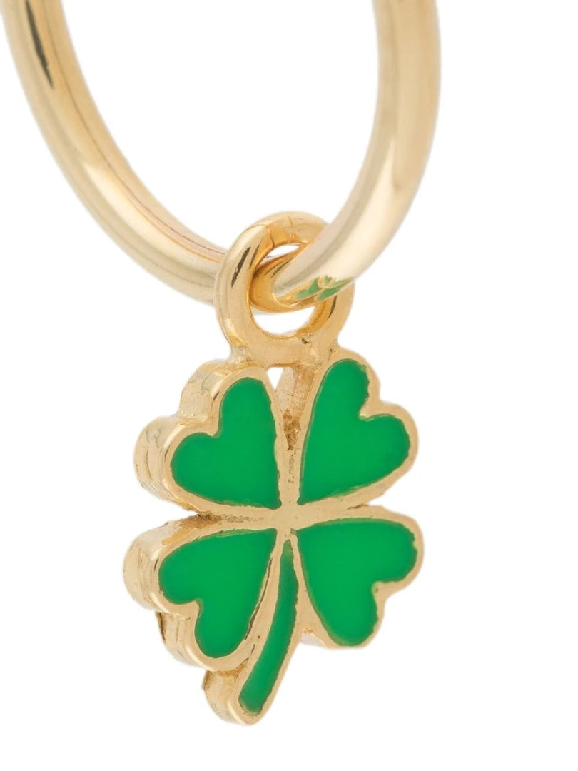 Wilhelmina Garcia ‘Lucky Clover Hoop Earring’ featuring a green four leaf clover charm, a hinged hoop fastening and gold tone hardware. Item comes as a single earring. Made in Spain.
