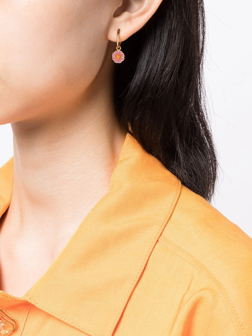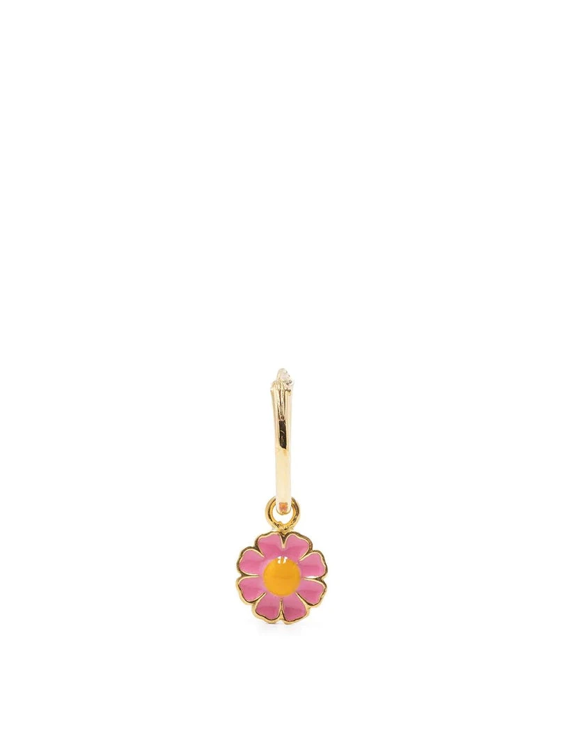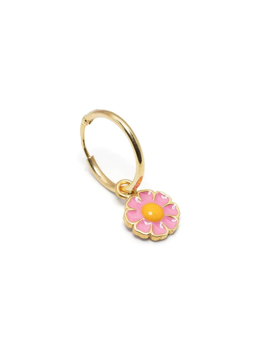 Wilhelmina Garcia ‘Pink Daisy Hoop Earring’ featuring a pink and yellow daisy charm, a hinged hoop fastening and gold tone hardware. Item comes as a single earring. Made in Spain.