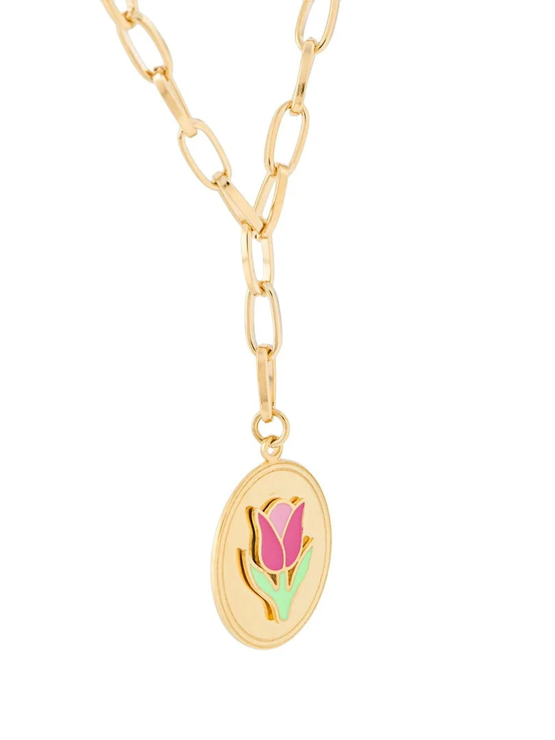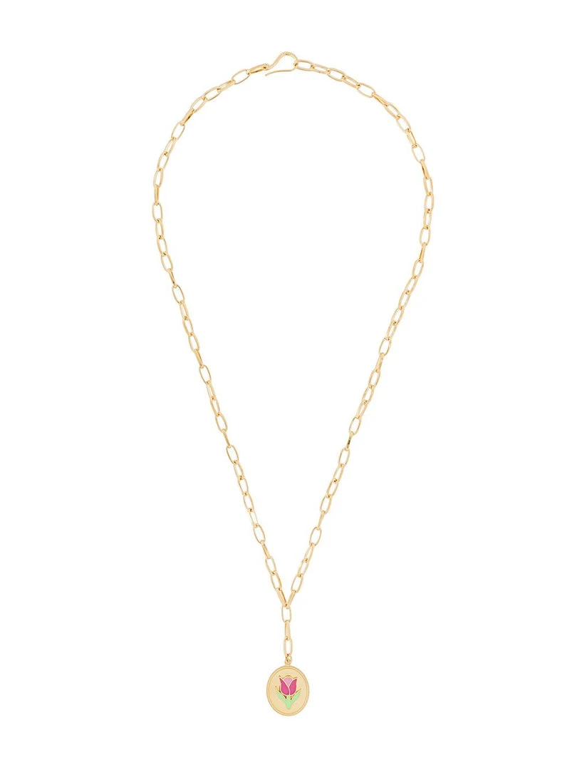 Wilhelmina Garcia ‘Pink Tulip Chain Necklace’ featuring an oval pink and green tulip pendant, a hook fastening and gold tone hardware. Chain is 60cm. Made in Spain.