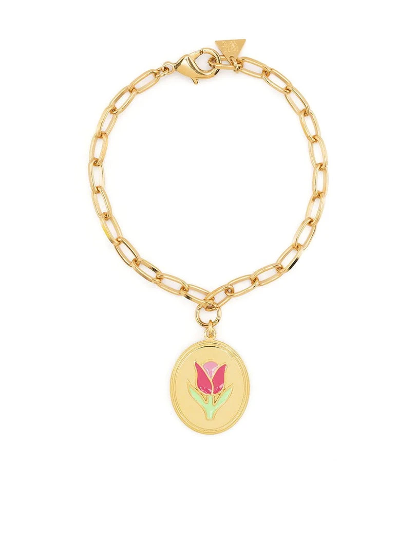 Wilhelmina Garcia ‘Pink Tulip Charm Bracelet’ featuring an oval pink and green tulip pendant, a chunky chain design, a lobster clasp fastening and gold tone hardware. Chain is 20cm. Made in Spain.