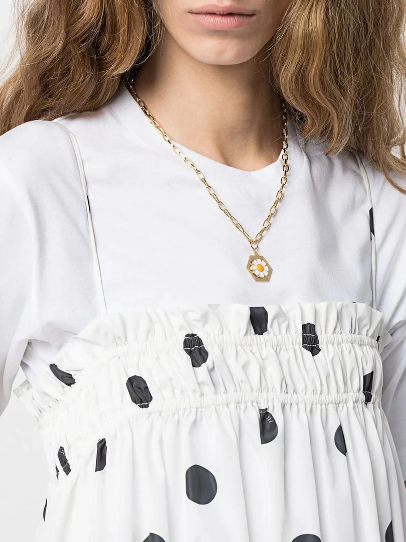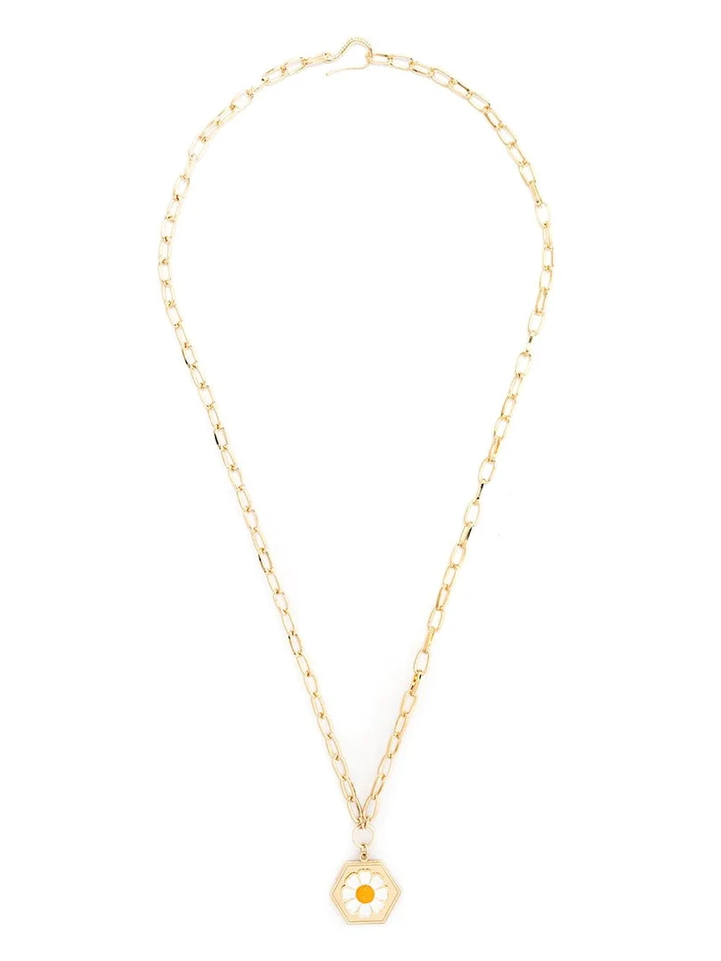 Wilhelmina Garcia ‘White Daisy Chain Necklace’ featuring a hexagonal white and yellow daisy pendant, a hook fastening and gold tone hardware. Chain is 60cm. Made in Spain.