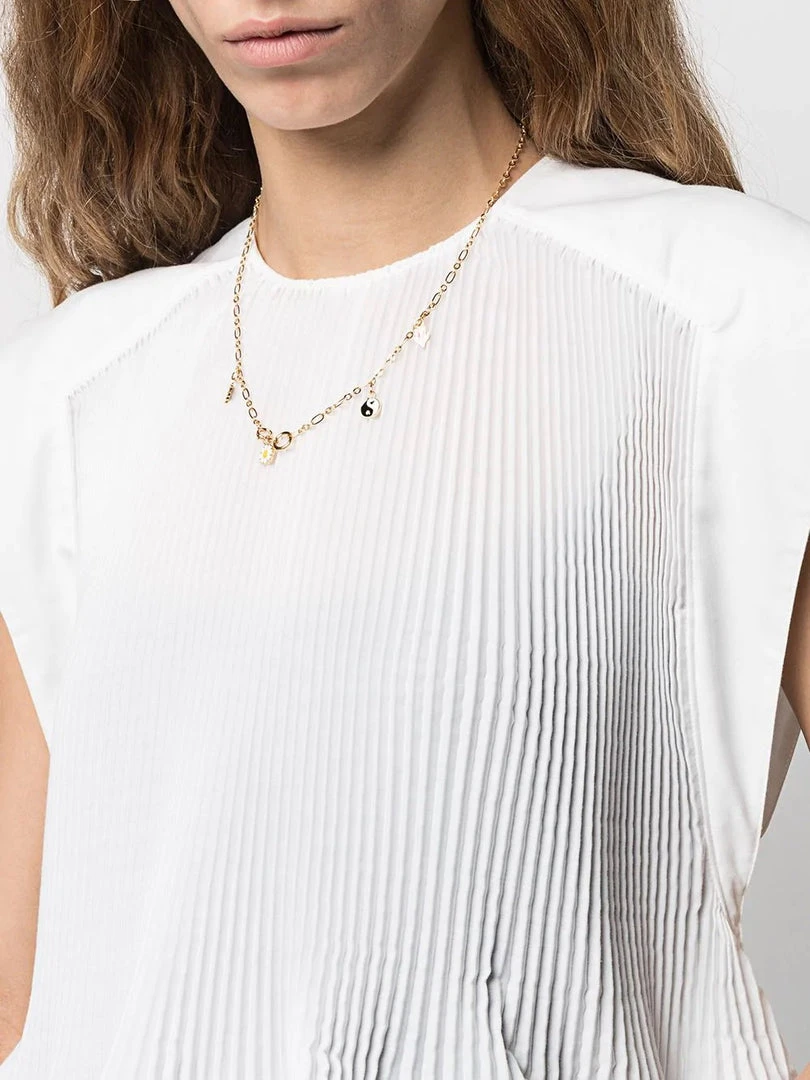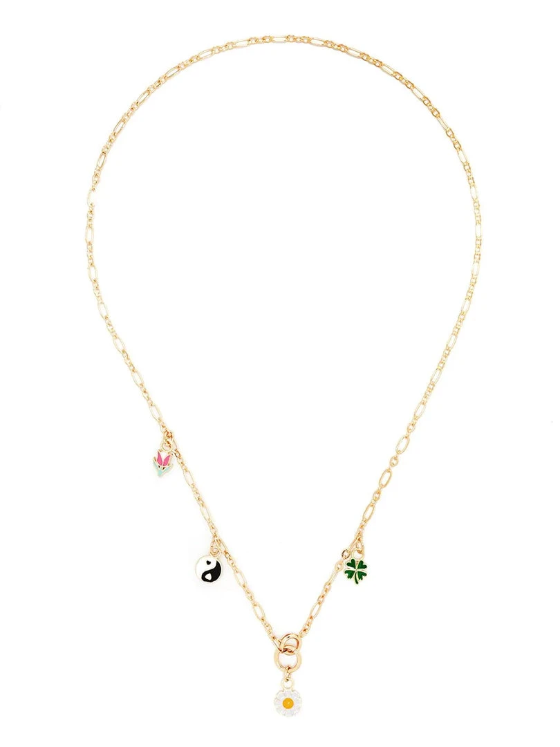 Wilhelmina Garcia ‘Four Charm Chain Necklace’ featuring a daisy, Yin Yang, tulip and four leaf clover charm pendant design, a lobster clasp fastening and gold tone hardware. Chain is 50cm. Made in Spain.