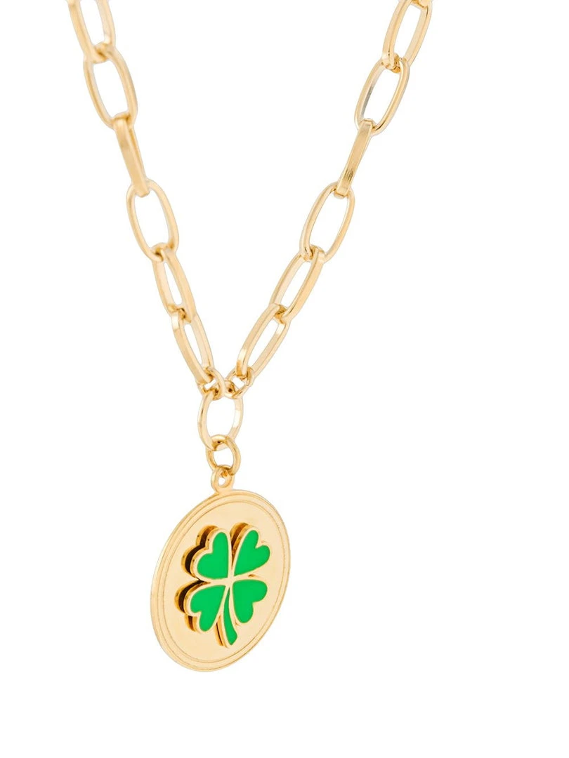 Wilhelmina Garcia ‘Lucky Clover Chain Necklace’ featuring a round green four leaf clover pendant, a hook fastening and gold tone hardware. Chain is 60cm. Made in Spain.