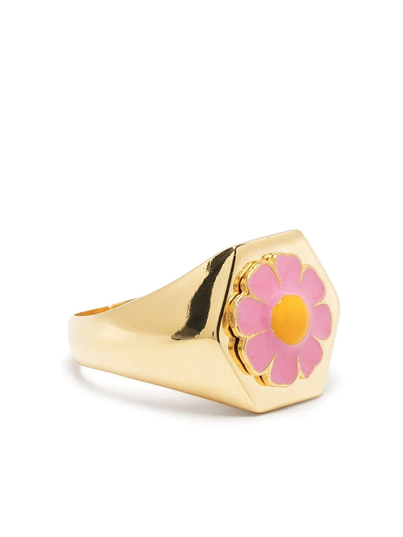 Wilhelmina Garcia ‘Pink Daisy Ring’ featuring a hexagonal frame, a pink and yellow daisy design, gold tone hardware and slips on. Item is EU ring sizing. Made in Spain.