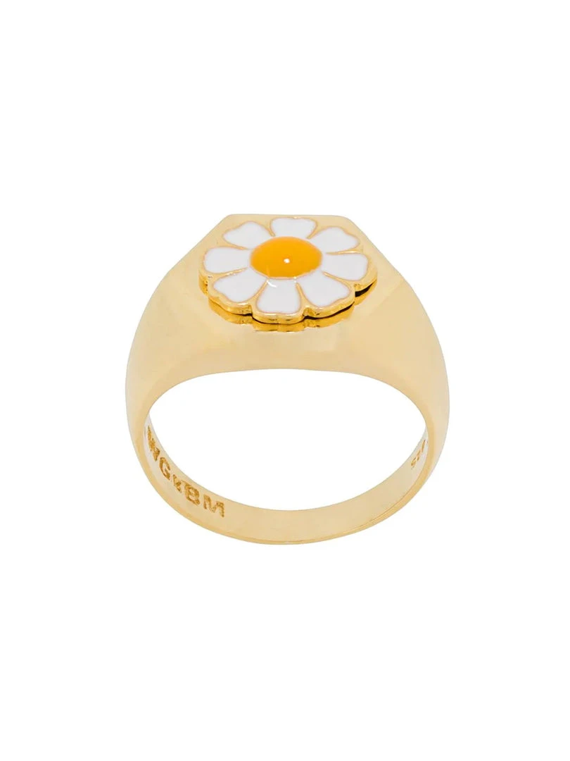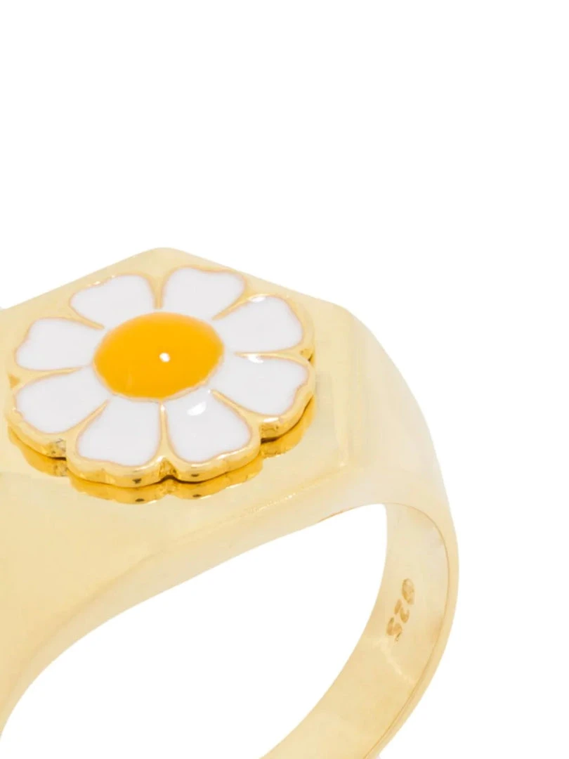 Wilhelmina Garcia ‘White Daisy Ring’ featuring a hexagonal frame, a white and yellow daisy design, gold tone hardware and slips on. Item is EU ring sizing. Made in Spain.