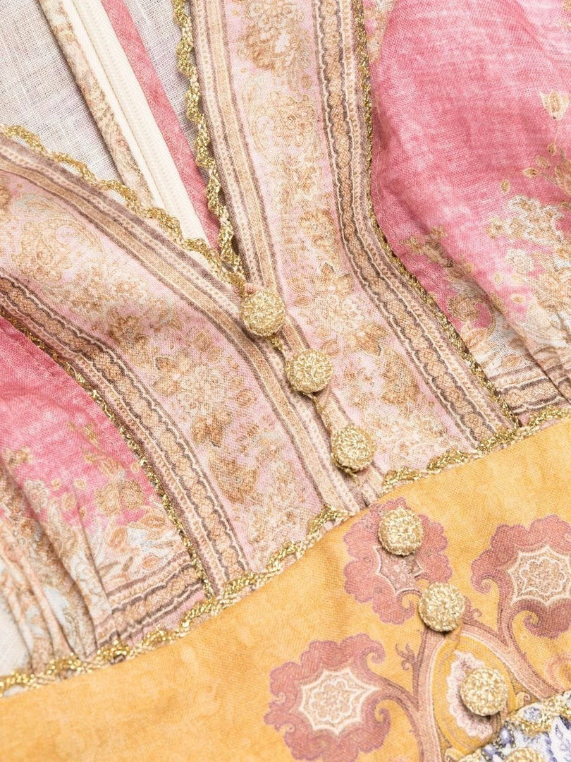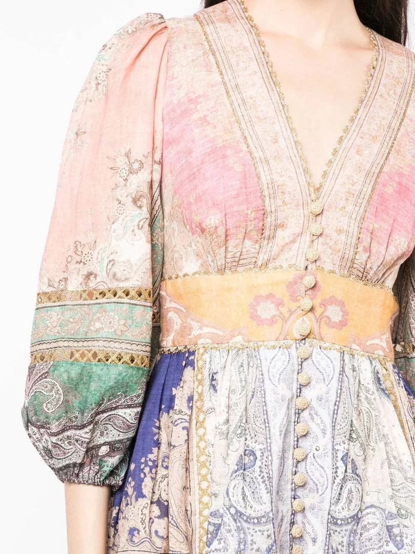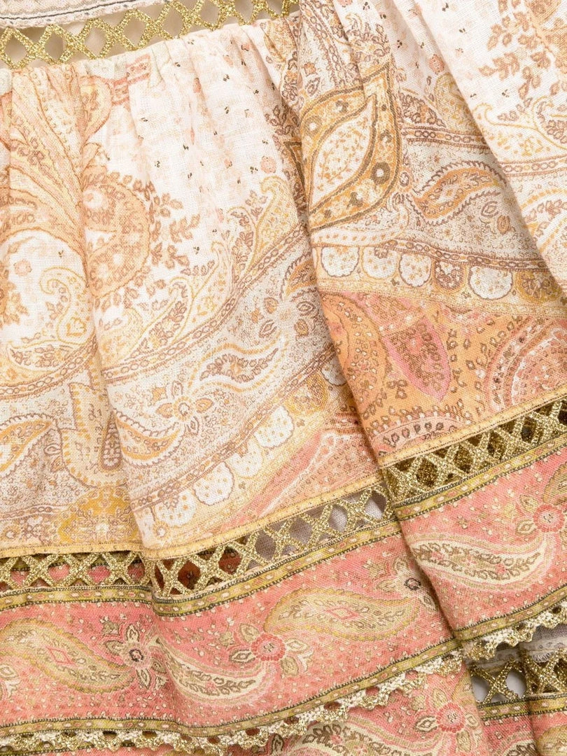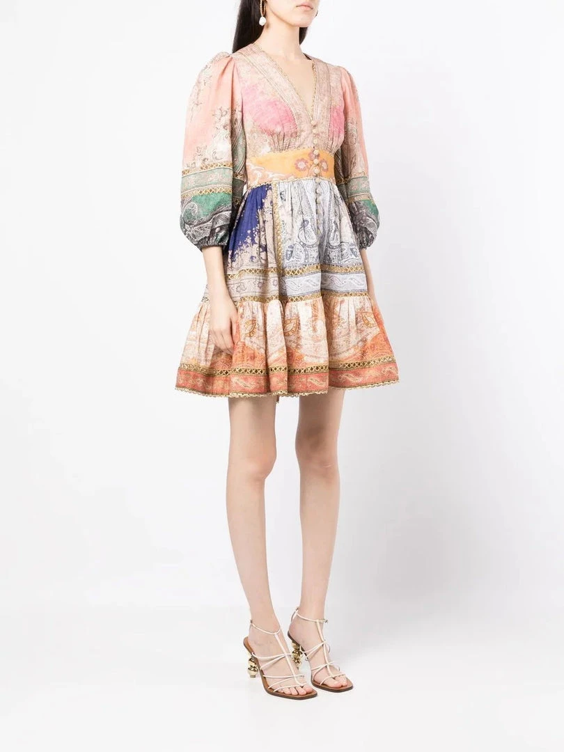 Zimmermann ‘Anneke’ lantern mini dress featuring a v-neckline, front button and loop fastenings, a back zip closure, long sleeves with elasticated cuffs, a multicoloured paisley print, gold lace trimming, a tiered hem and a short length. Item fits true to size. Model is wearing a size 0.