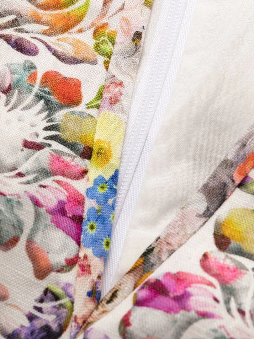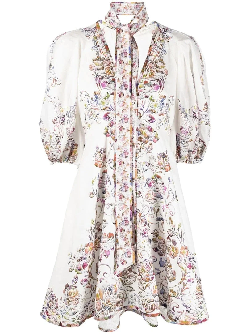 Zimmermann off white ‘Prima Day’ mini dress featuring a v-neckline, a back zip fastening, short puff sleeves with elasticated cuffs, a multicoloured floral print, a removeable tie scarf detail, side slip pockets, a flared skirt and a short length. Item fits true to size. Model is wearing a size AU 0.Â