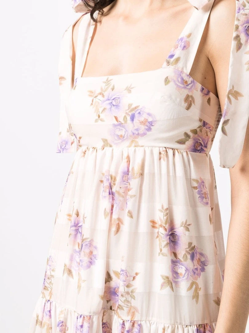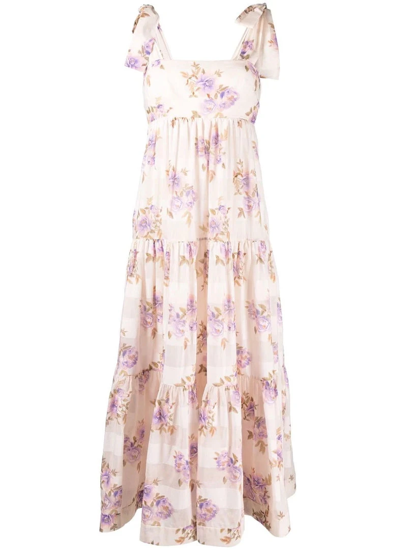 Zimmermann light pink ‘Rosa Striped Picnic Dress’ featuring adjustable tie straps, a straight neckline, a shirred back panel, a back zip fastening, an empire waistline, a tiered skirt, a sheer stripe and multicoloured floral print and a midi length. Item fits true to size. Model is wearing a size 0 AU.
